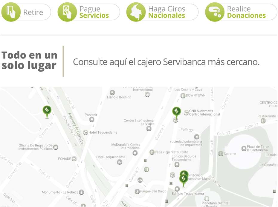 Cobertura Servibanca Servibanca lo acompaña en sus vacaciones. Utilice cualquiera de nuestros más de 2.300 cajeros automáticos ubicados en nivel nacional.