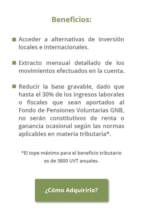 Fondo de Pensiones Voluntarias Banco GNB Invertir en el Fondo de Pensiones Voluntarias GNB le permitirá tener un capital disponible para eventualidades, disponer de este ahorro para la educación de sus hijos, cumplir sueños o metas establecidas.